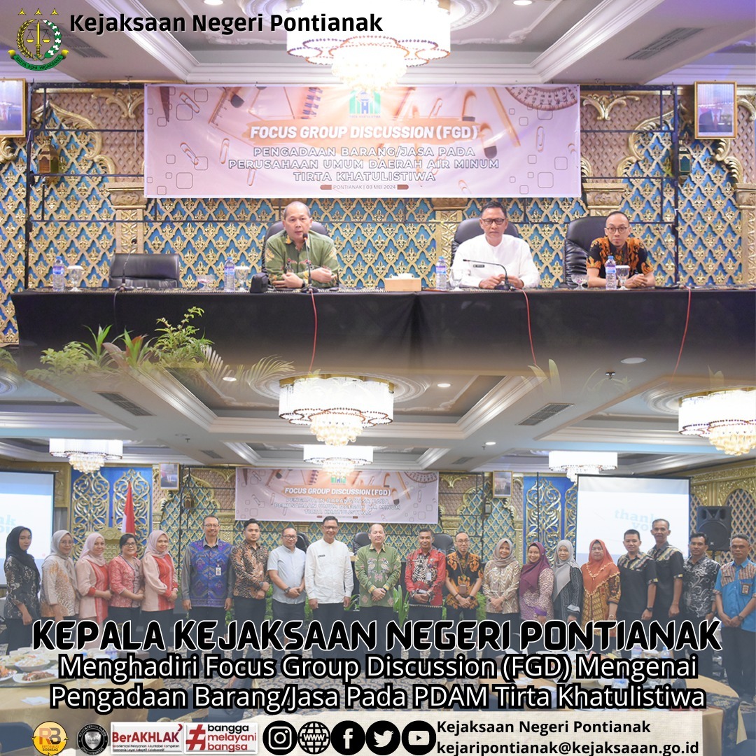 Jumat, 03 Mei 2024, bertempat di Hotel Mahkota Pontianak, Kepala Kejaksaan Negeri Pontianak Bapak Yulius Sigit Kristanto, S.H., M.H. menghadiri Focus Group Discussion (FGD) Mengenai Pengadaan Barang/Jasa pada PDAM Tirta Khatulistiwa Pontianak.
