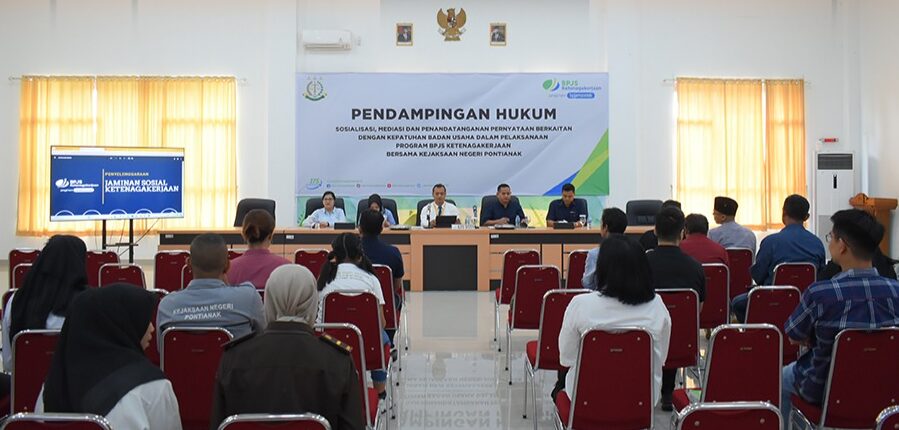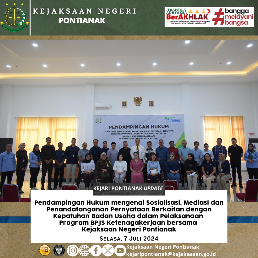 Selasa, 2 Juli 2024, pukul 10.00 Wib bertempat di Aula Kantor Kejaksaan Negeri Pontianak, Kepala Seksi Perdata dan Tata Usaha Negara Bapak I Nyoman Hendra Oktafriadi, S.H., M.H. membuka acara dengan tema “Pendampingan Hukum mengenai Sosialisasi, Mediasi dan Penandatanganan Pernyataan Berkaitan dengan Kepatuhan Badan Usaha dalam Pelaksanaan Program BPJS Ketenagakerjaan bersama Kejaksaan Negeri Pontianak”.