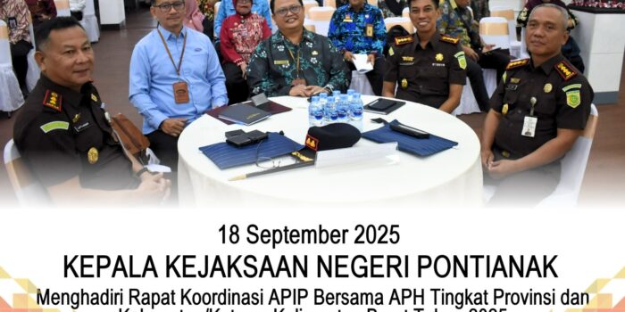Kamis, 18 September 2025 bertempat di Gedung Adhyasta Utama Kantor Inspektorat Provinsi Kalimantan Barat, Kota Pontianak Prov. Kalimantan Barat, Kepala Kejaksaan Negeri Pontianak Bapak Aluwi, S.H., M.H., menghadiri kegiatan Rapat Koordinasi Antara Aparat Pengawasan Internal Pemerintahan (APIP) dengan Aparat Penegak Hukum (APH) Tingkat Provinsi Dan Kabupaten/Kota se-Kalimantan Barat.