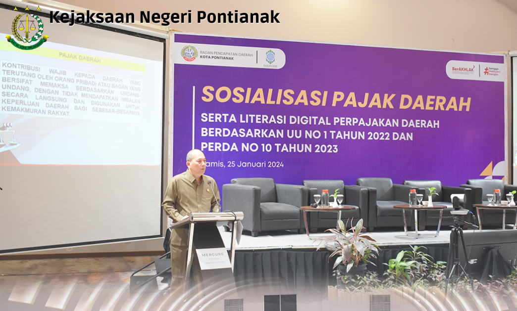 Kamis 25 Januari 2024 bertempat di Aula Lantai 9 hotel Mercurel, Kepala Kejaksaan Negeri Pontianak Bapak Yulius Sigit Kristanto, S.H., M.H. menjadi Pemateri dalam kegiatan Sosialisasi Pajak Daerah serta Literasi Digital Perpajakan UU No. 1 Tahun 2022 dan Perda No. 10 Tahun 2023