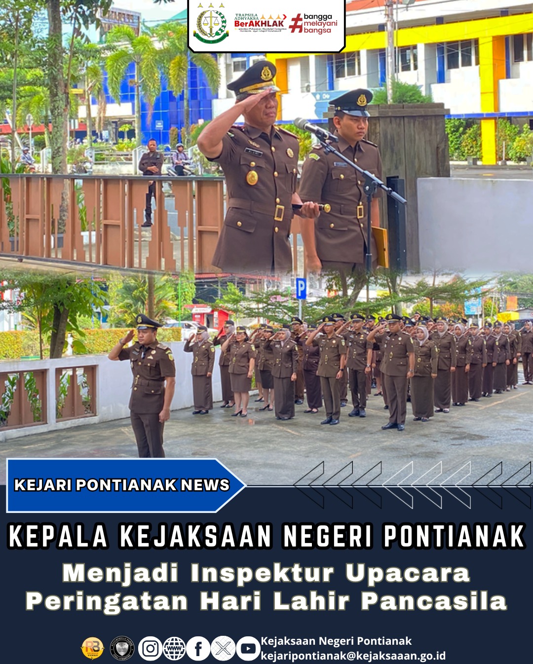 Pada Hari Senin, 02 Juni 2025 bertempat di Halaman Kantor Kejaksaan Negeri Pontianak, Kepala Kejaksaan Negeri Pontianak Bapak Aluwi, SH.,MH. menjadi Inspektur Upacara Peringatan Hari Lahir Pancasila dengan Komandan Bapak Dedy Saputro Syaras, SH.,MH. dengan diikuti oleh Seluruh Pegawai Kejaksaan Negeri Pontianak.